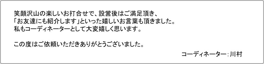 収納を綺麗に整理して頂き、将来の生活プランを見据えた提案もあったのでとても満足できる素敵な部屋になりました。